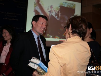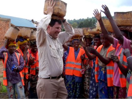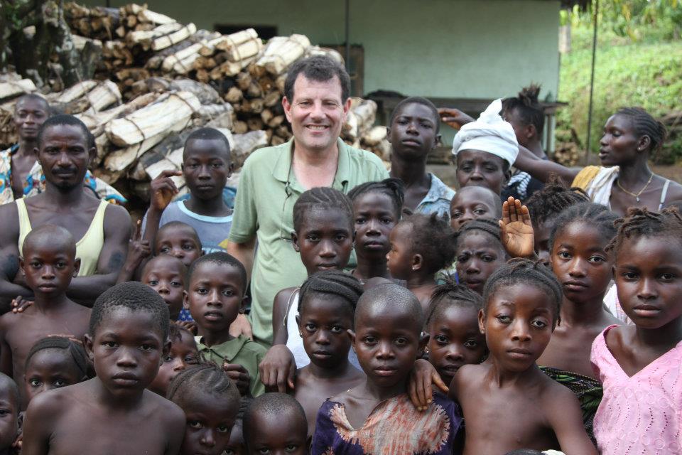Nicholas Kristof, in the middle of the image, surrounded by African children.