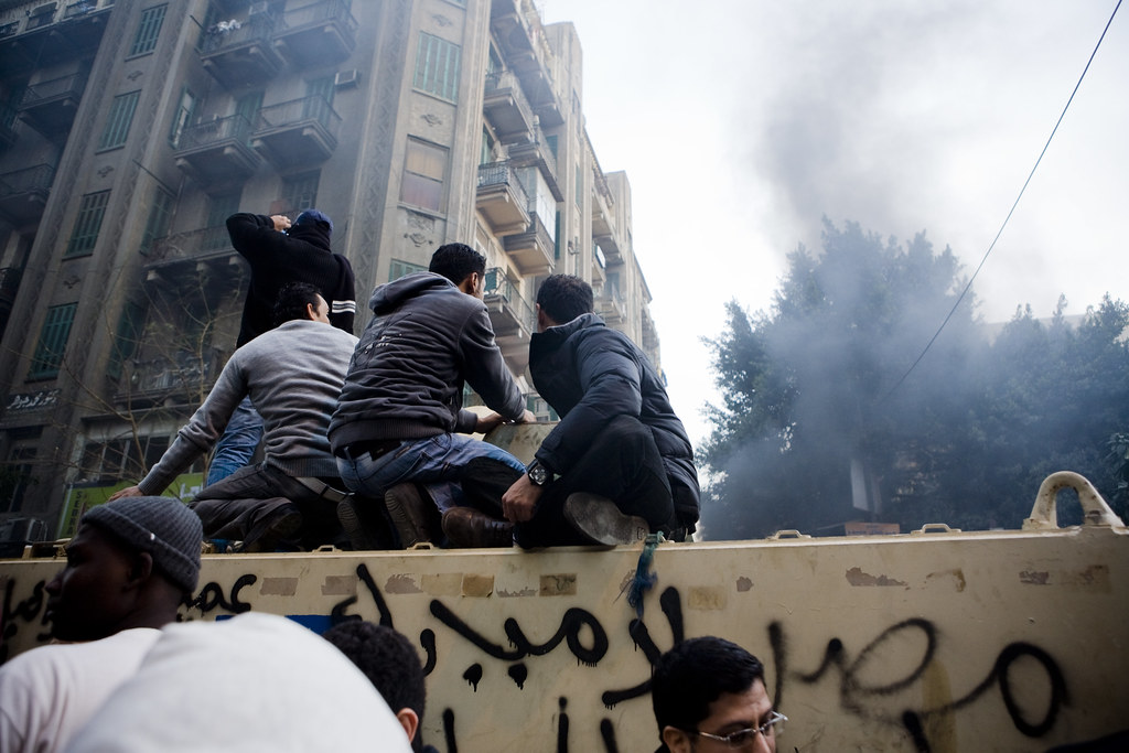 Protesters in January 2011 using an army tank as a shield to storm the Ministry of