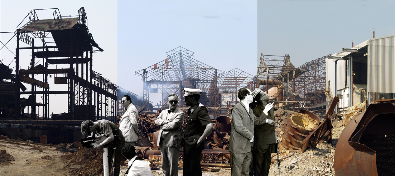 Baloji has often worked through juxtaposition, imprinting colonial images upon contemporary settings, and sometimes placing ruined colonial landscapes as backdrops for an interrogation of a ruined postcolonial present. His falsely anodyne panoramas bear traces of their past in greater or lesser degrees of visibility. At other moments his backdrops are more clearly defined by the presence of accumulated “imperial debris,” which has piled up and become sediment over the last 50 years. His are landscapes, figurative snapshots of colonial and postcolonial modernity, which appear as both sites and matrixes of what Ann Stoler calls “ruination.” For Baloji, juxtaposing a colonial-era image of barefoot Force Publique soldiers holding up for the camera a large bird, which some European officer just shot, collaged on a photograph of a contemporary refugee camp (see top image), provides a direct route to the entanglements of colonial oppression, environmental degradation, and postcolonial violence.