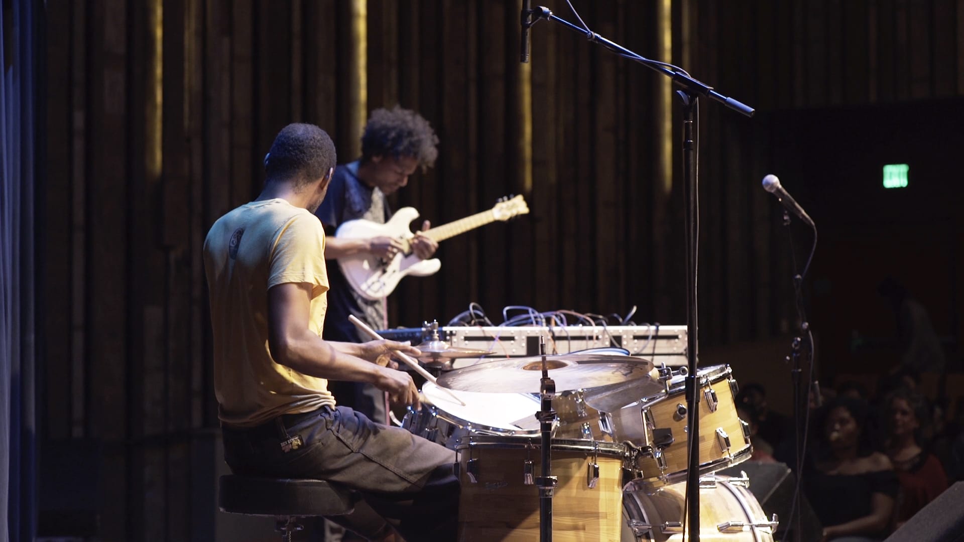 Over the course of a 40-minute sonic ceremony, Black Spirituals, composed of percussionist Marshall Trammell and electronic multi-instrumentalist Zachary Watkins, gave new meaning to the notion of technological “wizardry.” Methodically gathering fields of noise from Trammell’s precise but evolving drum patterns and Watkins’s space-clearing synthetic drones, the duo conjured what amounted to an awe-inspiring electrical storm (creative destruction, Samudzi called it). Their elements—one hard and punctual, the other open and spacious—met and complemented each other like the earth and the heavens. When after 15 minutes the drums fell silent, dissolving the musical container, the distant reverb of the synthesizers, ceaselessly recirculating, rushed into the void like wind through a cavern; as if by synesthesia, Black Spirituals crafted an ethereal landscape of sound.