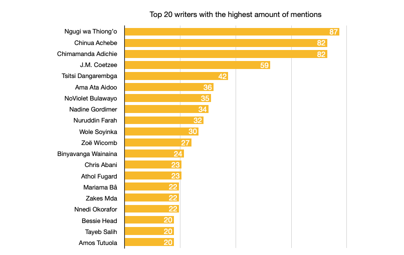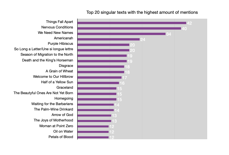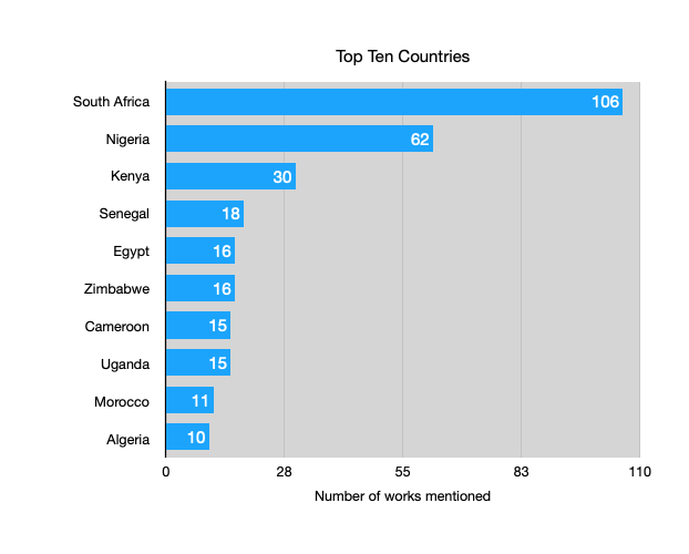 Though it was expected that Nigerian and South African texts would dominate the field, we did not anticipate how extreme this would be. Most countries on the continent are represented on curricula by less than five individual texts, whereas 62 Nigerian literary works and a whopping 106 South African are regularly taught.
