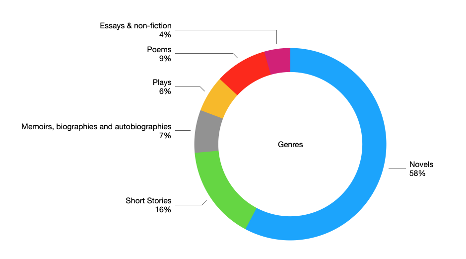 Of the 671 texts that were listed by our respondents, the majority were novels (369) and short stories (101), while memoirs, biographies and autobiographies (46), poems (56), plays (39), essays and non fiction books (28) and anthologies (32) made up the balance.
