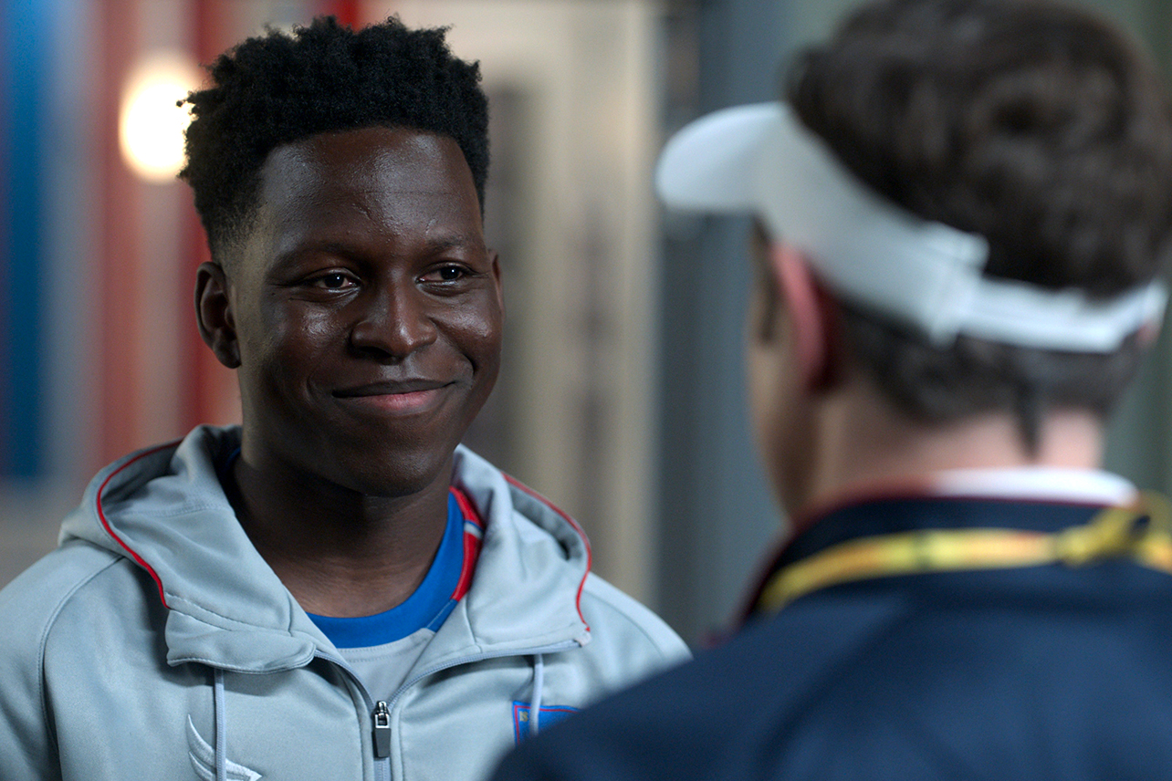 To Edwin’s surprise, following AFC Richmond’s win promoting them back to the Premier League in the season two finale, Sam tells Edwin that he is going to stay with Richmond: “I don’t believe my time here at Richmond is over, and for that reason I have to stay. I hope you can understand.” Edwin’s expression sinks, and in a fit of rage, calls Sam a “Nigerian motherfucker” and “Yoruba trash,” and vows to “dedicate my life to destroying you . . . you will never play on the Nigerian national team.” Sam takes the high road, and simply responds: “OK,” with a smirk. As Edwin exits the Richmond locker room, he continues to hurl ethnic slurs and threats of violence at Sam in an over-the-top tantrum.