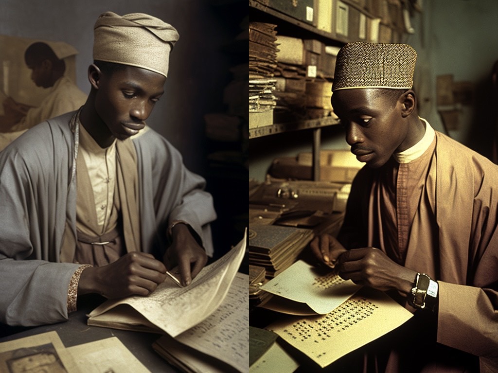 A computer generated image of a young Hausa man exploring archival records. Generated by Artificial Intelligence