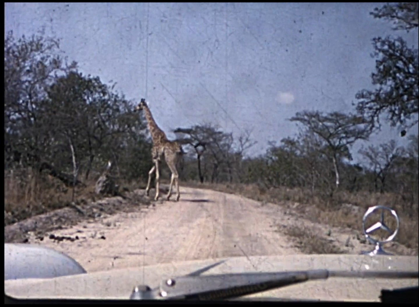 The film opens with 19 minutes of silent film footage of a white Brazilian family touring the Kruger National Park. The wife is in a beehive, the daughter in the clothes children wore in the 1960s. They are being driven around in a Mercedes sedan by a driver in a peaked cap. This is an early marker of economic access: the drive through the park is often framed through the windscreen of the Mercedes, the glinting three-point star clearly visible: