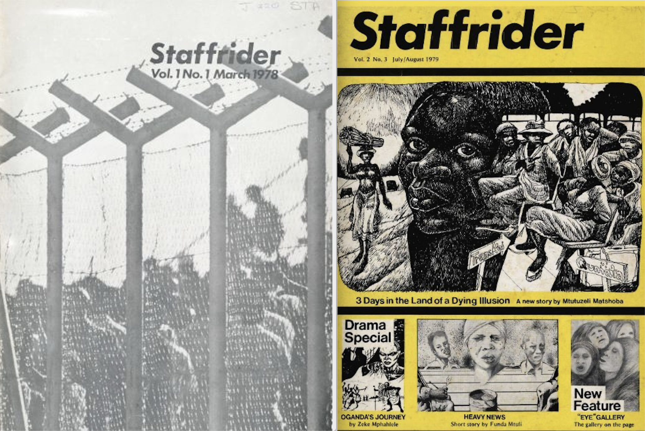 They live on working-class economic margins, due to their unstable relationship to wage labor which prevents them from affording the cost of a train ticket. Overworked, underpaid, and with dompasses controlling their mobility, these young men respond to their precarious status by taking chances with time. As Mike Abrahams observes, “here timing is a matter of life and death.” We call them staffriders because they represent a particular consciousness of institutionally outlawed black men. Black men who see spaces of danger and potential death as spaces of self-redefinition. When the founders of Staffrider decided to name this experience in a magazine, they sought to use literature as a way to foreground this metaphor or consciousness, which visualizes and collates the conditions creating a staffrider.