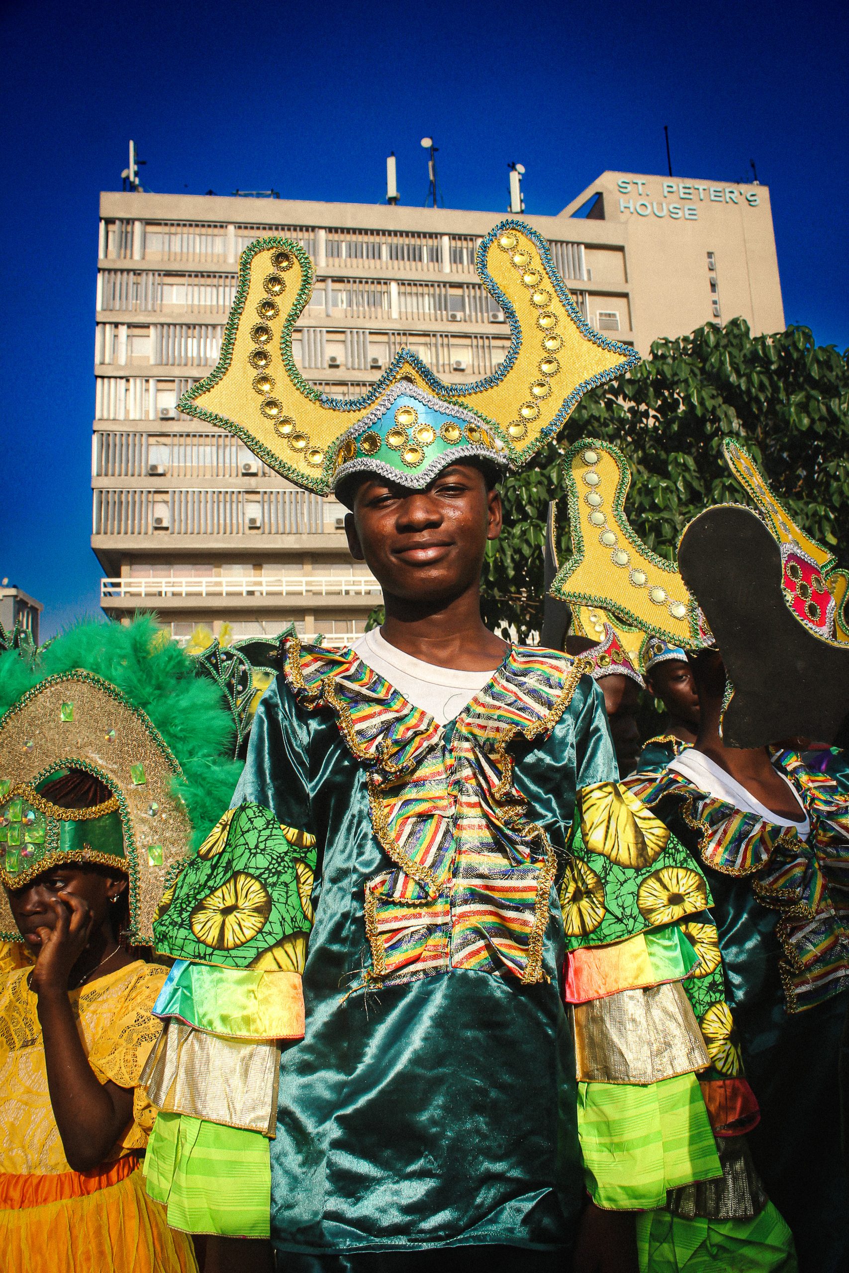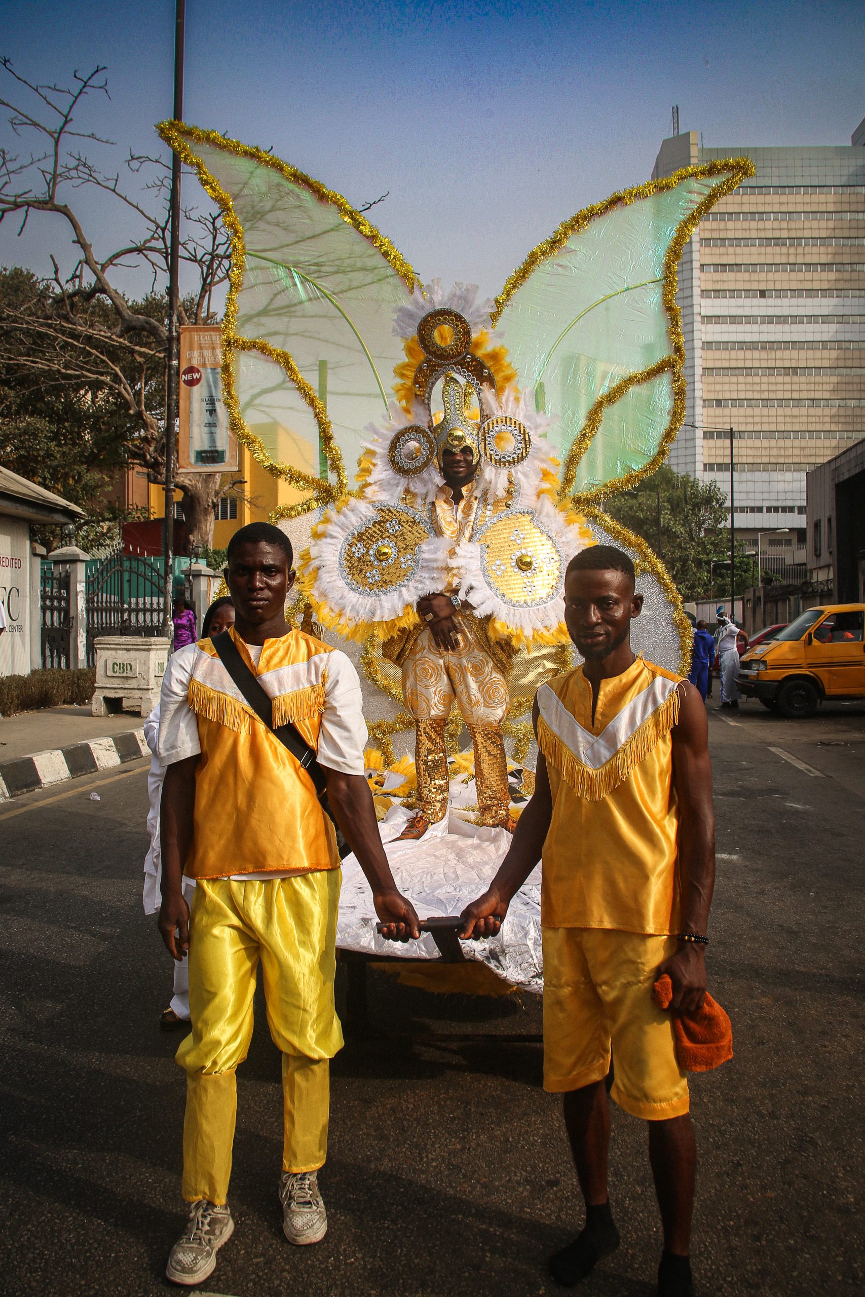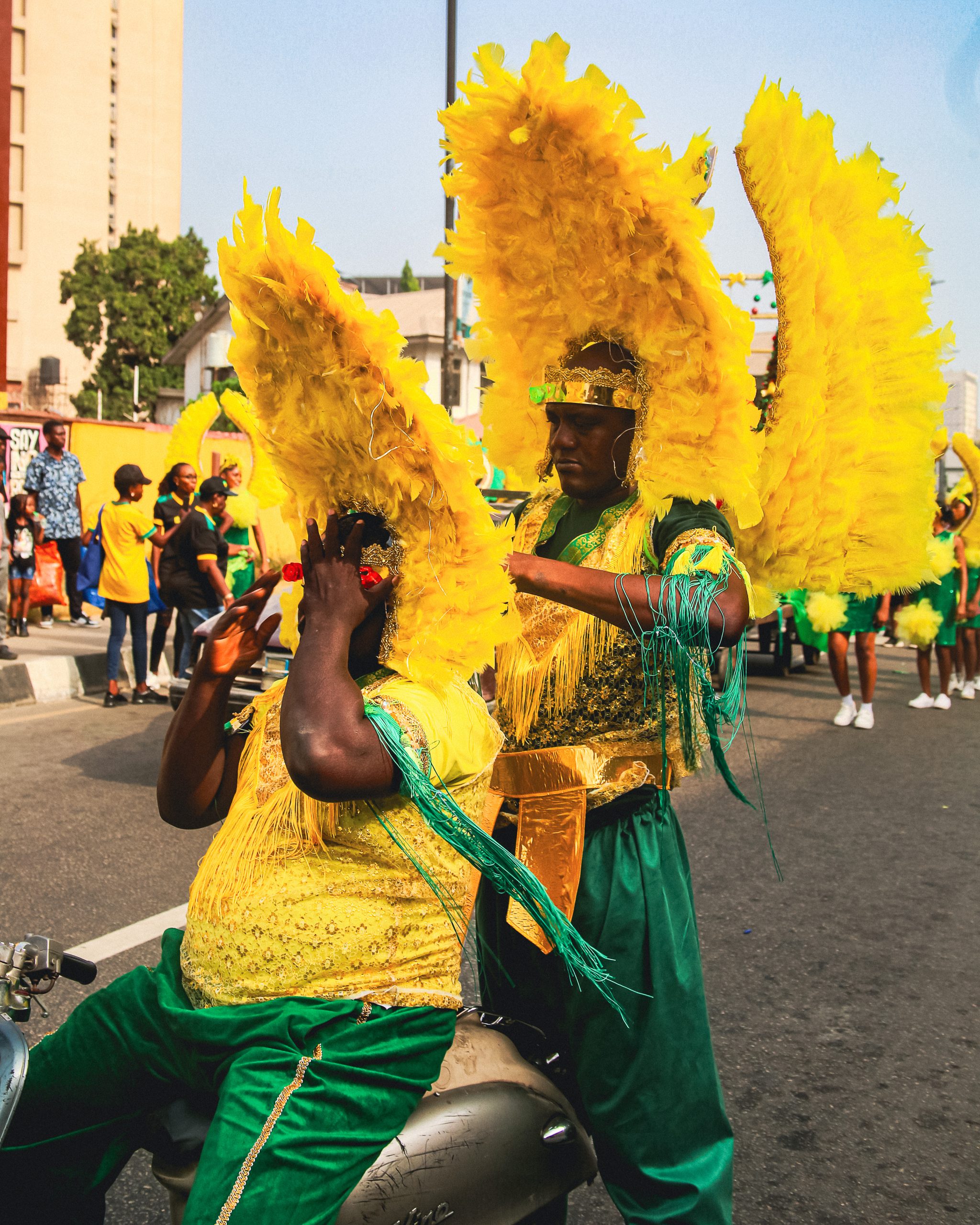 As the carnival procession begins, the Oko Faji group takes the lead, their vibrant red, blue, and white costumes catching the eye as they march with purpose. Behind them, the streets of Popo Aguda fill with a kaleidoscope of color and movement, each troupe adding its own flair to the procession. The well-known Campos Caretta troupe follows, their striking green and yellow costumes impossible to miss, a symbol of their longstanding presence and pride in the celebration.