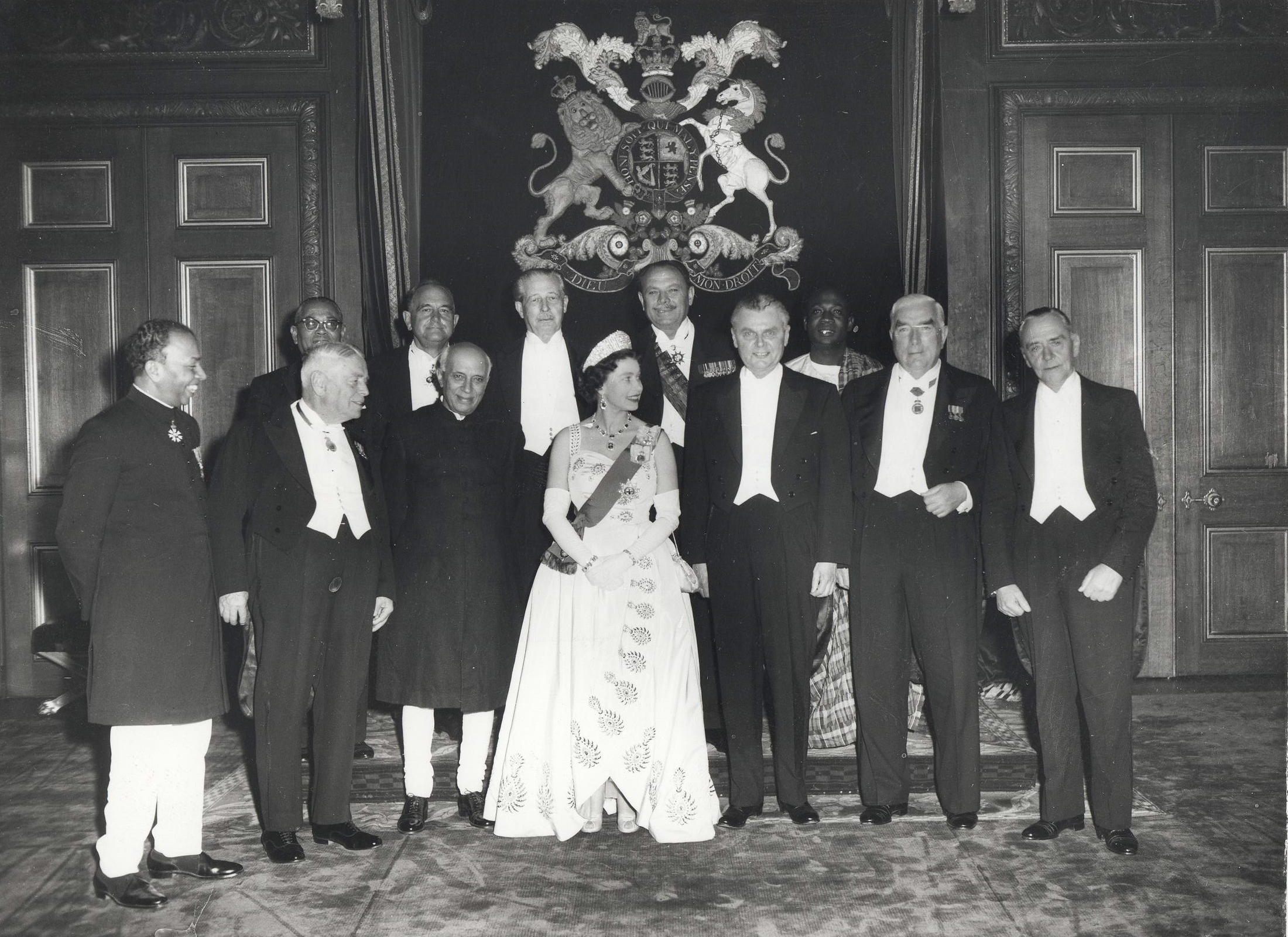 Queen Elizabeth II stands with Commonwealth prime ministers, including Jawaharlal Nehru and Kwame Nkrumah, at the 1960 Commonwealth Prime Ministers’ Conference at Windsor Castle. Image credit the UK Government via Wikimedia Commons CC0.
