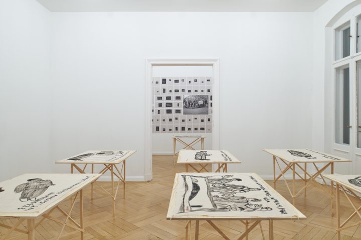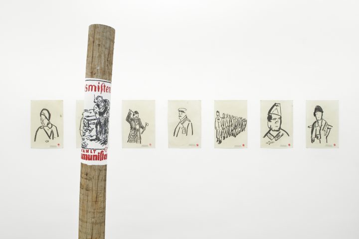 Because language is an effective marginalizing weapon, Nazareth often twists it, as in the exhibition title, where the Portuguese for “German” becomes a word that speaks to otherness in both languages. In German, alle Mann signals the idea of the “universal man”; in popular Brazilian Portuguese, alemão has come to mean the antagonist. But for Nazareth, language is never abstract. In the first exhibition room of his show, the eight posts with communist and anti-communist propaganda have a shape that recalls a brutal colonizing apparatus, and their eucalyptus material speaks to the persistent deforestation of extractive capitalism. Sanctioned violence is articulated so sharply that bodies are conjured in that space. Haunting these central posts, the 2025 charcoal drawing series Everything I was taught about the German soldier in USA movies features soldier figures that seem to emerge from First World War trenches, the cangaço of the Brazilian sertão, and Bram Stoker’s Gothic terror. In the violent power plays of dominant politics, ignorance can never go missing.